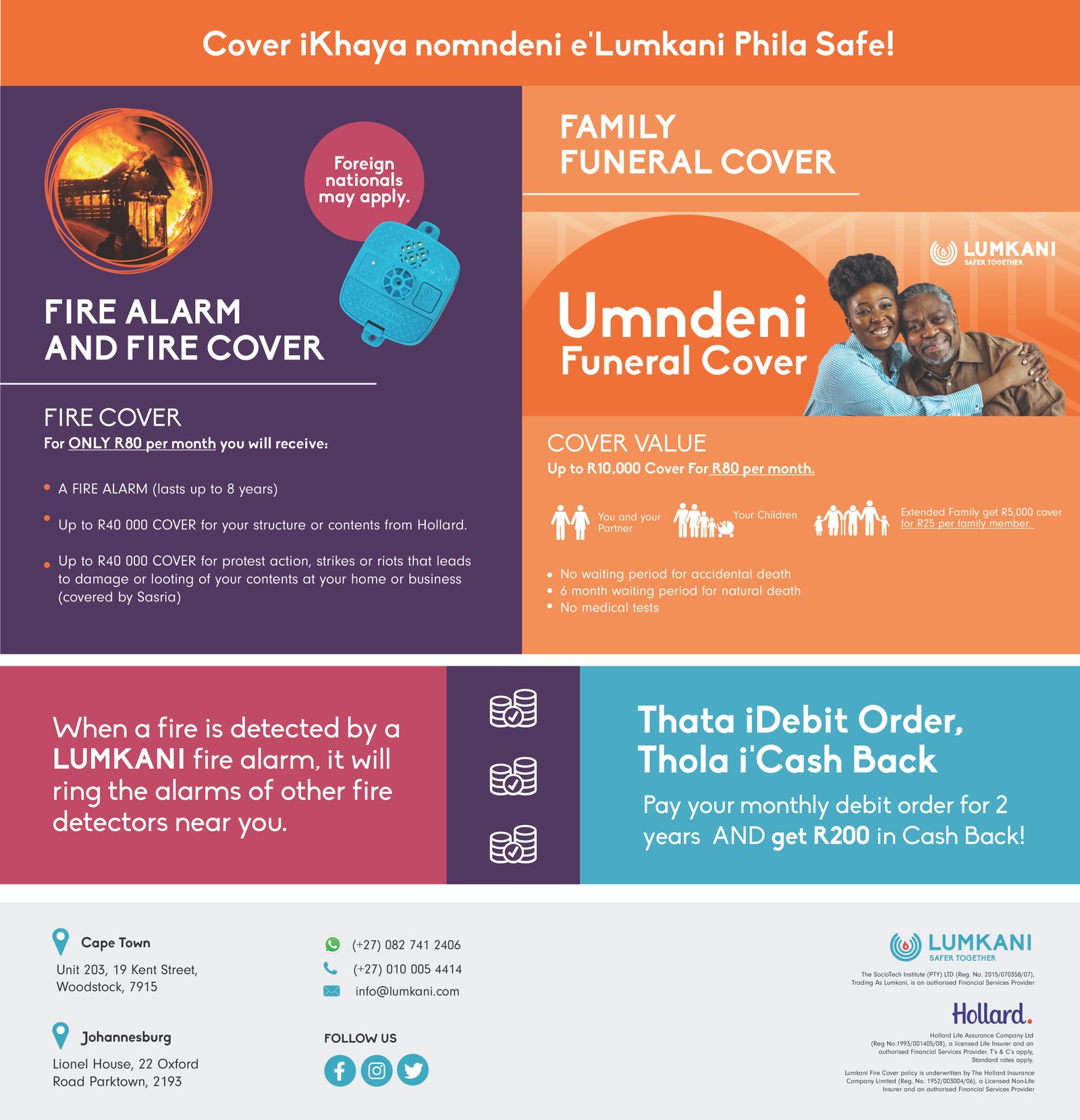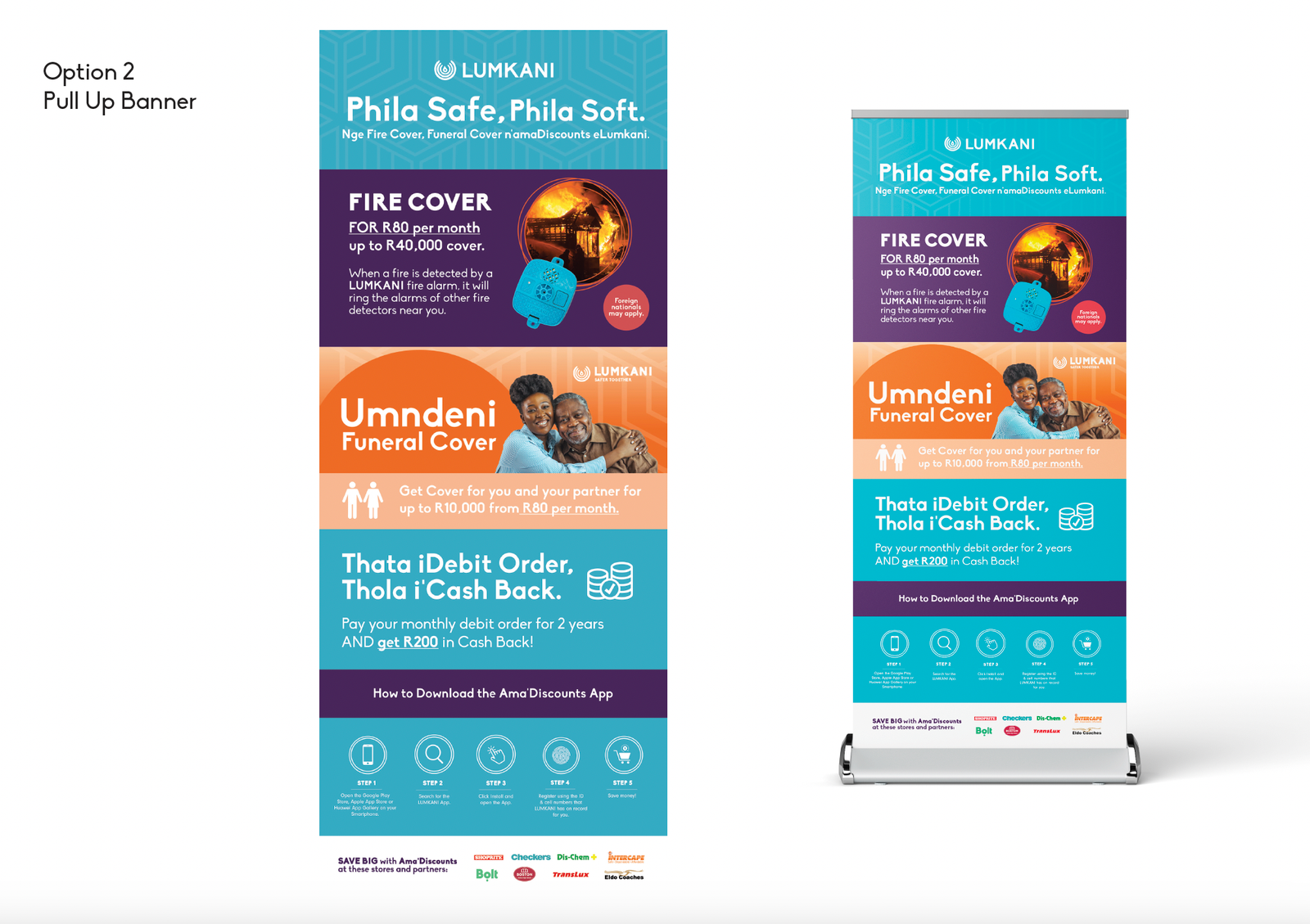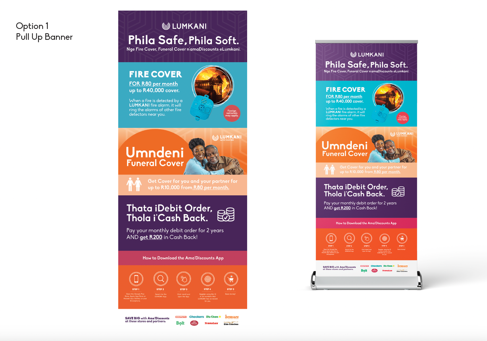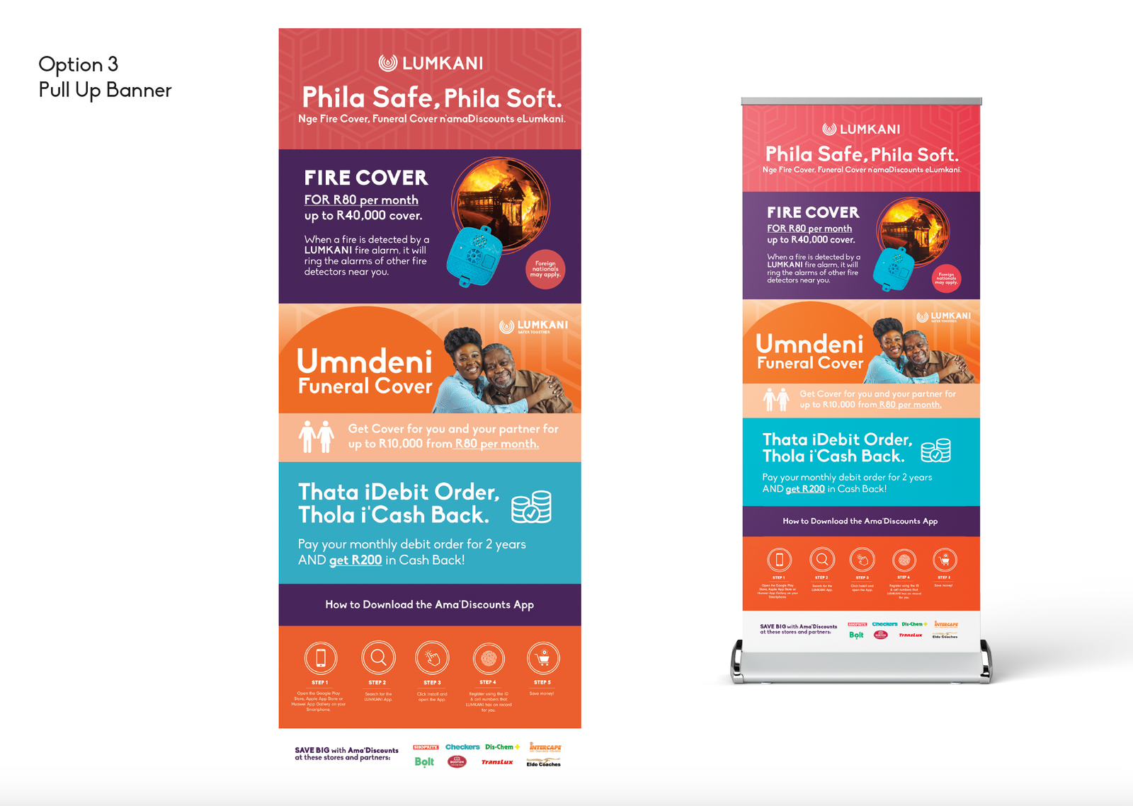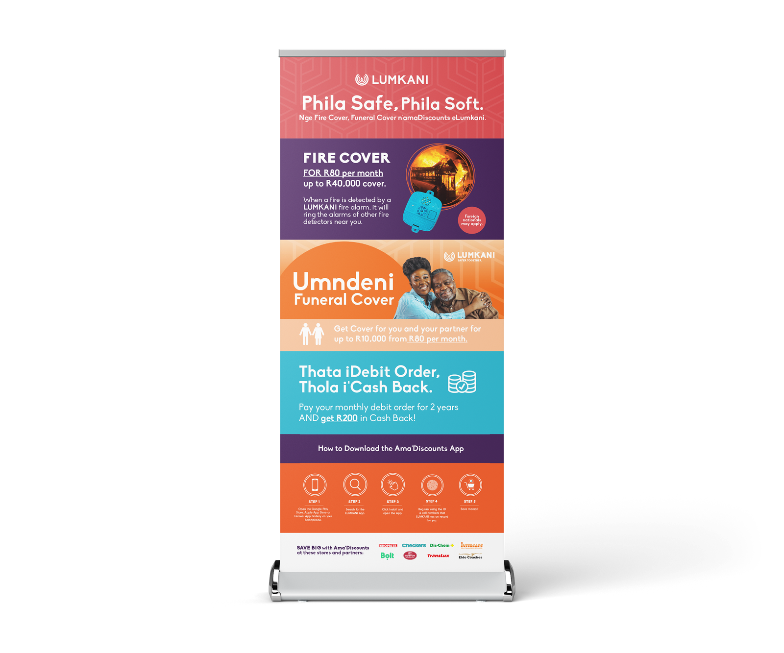 Lumkani, a leading provider of innovative safety solutions, engaged Baadaye Agency to develop a range of graphic design assets to support the launch of their new funeral and fire cover offering, and exclusive AMA’discounts deals. Our goal was to create cohesive and visually appealing print and digital materials for use across various marketing channels, enhancing Lumkani’s brand presence and effectively communicating its new offerings.
